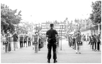 ▲ 广东省佛山市公安局民警对功夫平安志愿队队员开展岗前培训。