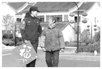春节临近,江苏省宜兴市公安局阳羡生态旅游度假区警务工作站组织开展“新春走基层 送福送平安”活动,在访民情、解民忧、护民安的同时,把辞旧迎新的美好祝福送到群众家中。图为民警向辖区老人赠福字。 本报记者 罗莎莎 本报通讯员 王杰 摄