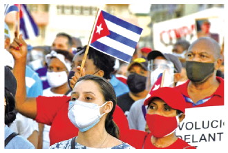 图为古巴民众在首都哈瓦那参加爱国集会,抗议美国对古巴长期封锁、反对美国政府资助反古势力煽动骚乱。