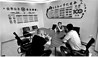 图② 法律明白人在桃园村调解室主持调解村民邻里纠纷。