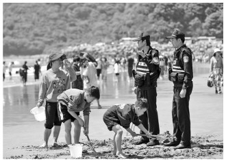 “五一”小长假期间,浙江省舟山市普陀山景区游客络绎不绝,舟山市公安局普陀山分局朱家尖派出所民警辅警坚守在辖区景区开展巡逻执勤,守护游客平安。图为5月2日,民警提醒一位家长在游玩时注意观察孩子动态,确保游玩安全。