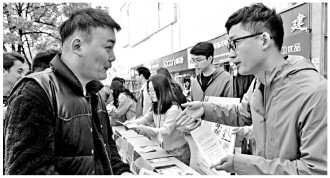 4月8日,江苏省镇江市润州区七里甸司法所联合江苏大学法律援助中心开展“送法进市场”活动,组织律师、志愿者来到五里社区辖区内的小商品市场,向经营户和市民宣讲法律法规。图为经营户在向律师咨询法律援助方式。