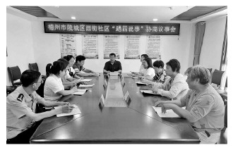 图④ 陵城区建立“遇四说事”协商议事机制,每月4日、14日、24日由社区召集居民代表、业委会、物业召开会议,畅通问题反映渠道,共商难题破解办法。