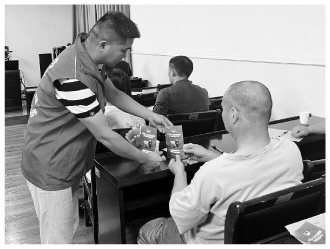 江苏省江阴市司法局月城司法所工作人员向社区矫正对象发放社区矫正法宣传手册。 刘修之 摄