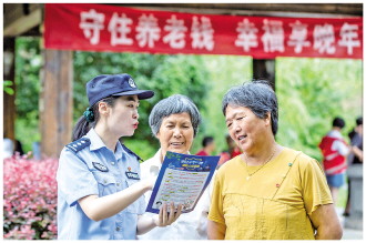▲ 连日来,江苏省海安市公安局城南派出所组织民警走进“城中村”、居民小区等老年人集中区域,开展防范养老诈骗专项宣传活动,帮助老年人提高法治意识和防诈反诈能力。图为民警在海安街道西楹社区向老年人宣传防诈骗知识。 本报记者 罗莎莎 本报通讯员 翟慧勇 摄