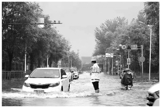 河北省保定市近日出现强降雨天气,市区诸多路段发生群众、车辆受困情况。保定市公安局交警支队科学合理调整路面勤务部署,全警动员投入防汛抢险救援,疏导交通、转移群众,全力保障人民群众生命财产安全。图为保定公安交警在雨中指挥交通、疏导车辆通行。