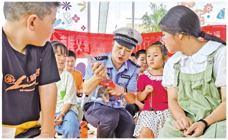 8月15日,安徽省南陵县公安局交管大队民辅警在辖区儿童中开展交通安全宣传活动,增强他们知危险、会避险意识。图为辅警在南陵县烟墩镇霭里村书屋向儿童宣讲安全出行知识。 本报通讯员 黄莺 秦耕耘 摄