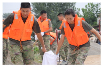 ▲ 图为8月8日,陆军第82集团军“铁军旅”官兵在大清河天津静海段装填沙袋加固堤坝。 本报通讯员 杨仕伟 摄