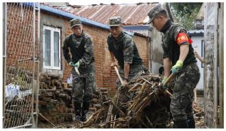 ▲ 图为8月14日,武警黑龙江总队机动支队官兵给驻地村庄清淤。 本报通讯员 许家铭 摄