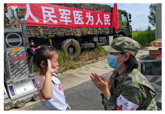 “你好棒啊!”小诗淇的敬礼虽然不标准,但是赢得医疗队队员的赞美和掌声。