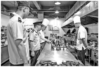 8月16日,安徽省含山县公安局花山派出所组织民警对辖区内酒店及其周边场所食品经营单位等进行全面检查。民警针对酒店餐厅食品原材料采购、运输、贮存、出入库等环节是否存在索证索票不全、食物过期、未按规定消毒消杀以及“三无”产品等问题展开全面排查,确保不留死角隐患。图为民警对酒店食品安全进行检查。 本报通讯员 冯善军 摄