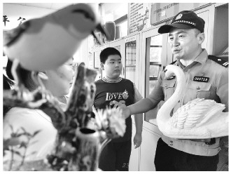 ▲ 8月15日,安徽省舒城县公安局棠树派出所民警来到辖区云雾村农家书屋,向来看书的小朋友们开展野生动物保护普法宣传。图为民警通过鸟类模型向小朋友生动讲解野生动物相关保护知识。 本报通讯员 盛宏菲 摄