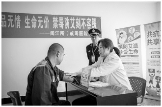 近日,福建省闽江司法强制隔离戒毒所(福建省司法戒毒医院)派员前往宁德监狱开展普法禁毒宣传教育及诊疗活动。民警围绕禁毒知识进行宣讲,并通过设置法律咨询服务台,对服刑人员关心的问题进行释法说理。图为戒毒医院医务人员为服刑人员开展健康诊疗。