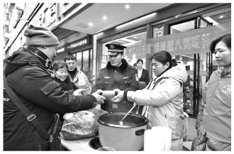 1月18日,安徽省阜南县鹿城镇骆寨社区居委会联合县公安局水上派出所举办“情暖腊八 粥暖邻心”活动,为辖区居民发放热腾腾的腊八粥,弘扬传统民俗文化,增进警民感情。图为民警和社区工作人员为居民发放腊八粥。 本报通讯员 吕乃明 摄