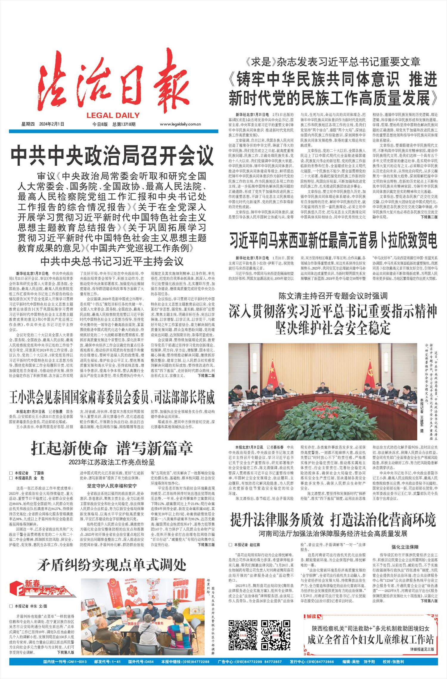 会议强调,2024年是新中国成立75周年,是实现“十四五”规划目标任务的关键一年,全国人大常委会、国务院、全国政协、最高人民法院、最高人民检察院党组要以习近平新时代中国特色社会主义思想为指导,坚持党中央集中统一领导这个最高政治原则,紧紧围绕推进中国式现代化这个最大的政治,持续抓好党的二十大战略部署的贯彻落实。要抓好高质量发展这个首要任务,深化改革开放,确保中央经济工作会议确定的重点任务落地落实,推动经济实现质的有效提升和量的合理增长。要树牢造福人民的政绩观,增进民生福祉,维护社会公平正义。要统筹高质量发展和高水平安全,坚持底线思维,增强斗争意识,提高斗争本领。要认真履行全面从严治党主体责任,带头贯彻执行中央八项规定及其实施细则精神,以身作则、率先垂范,把党的自我革命抓具体、抓深入。中央书记处要强化政治担当,扎实履职尽责,加强自身建设,继续高质量完成好党中央交办的各项任务。