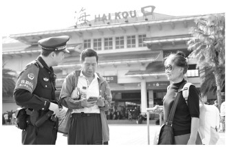 今年春运以来,海口铁路公安处海口站派出所合理调配一线警力,提高见警率和管事率,全力维护乘降秩序,护航旅客平安出行。图为民警协助旅客进站乘车。 本报记者 翟小功 本报通讯员 陈珊 摄