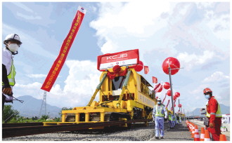 图为2022年4月20日,工作人员在印度尼西亚万隆雅万高铁铺轨施工现场作业。当日,雅万高铁开始启动铺轨施工。