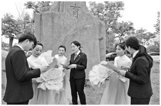 4月30日上午,山东省莒南县人民法院组织干警到石莲子镇“西瓜节”现场,开展以“让婚姻始于‘爱’,让彩礼归于‘礼’”为主题的法治宣传活动。图为法院干警向群众宣传婚约、彩礼等法律知识。