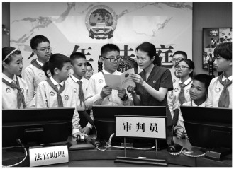 ▲ 重庆市高新区第一实验小学学生代表近日受邀来到重庆市第五中级人民法院,开启“寻法”之旅。同学们通过观摩诉讼服务中心、参观少年审判法庭等,了解法官职业职责,进一步养成知法学法懂法用法良好习惯。图为在该院少年法庭,法院干警与同学们一起学习未成年人保护法。 本报记者 战海峰 本报通讯员 尚博 摄