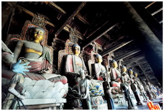 拾级而上,雄踞于高台之上的大雄殿,殿堂深邃,撼人心魂。这里遗存有世界规模最大、最古老的彩绘泥塑造像群,还有2300余幅建筑彩绘,全部为辽代原作,艺术价值极高。