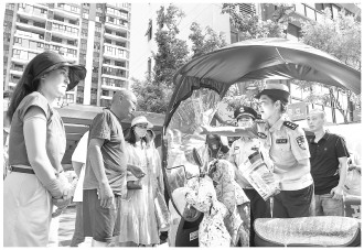 8月6日,安徽省马鞍山市含山县公安局环峰派出所联合交管大队组织民警走进攀桂社区,开展普法宣传。图为民警向群众讲解交通安全法律知识。 本报通讯员 冯善军 摄