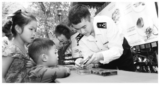 广州海关关员向小朋友展示和讲解在口岸截获的有害生物标本。
