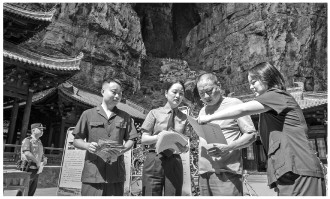 近日,重庆市武隆区人民法院携手区人民检察院、区公安局在武隆喀斯特地貌景区开展普法活动。干警向游客讲解司法保护令的作用和意义,号召广大游客共同守护珍贵的自然宝藏。图为干警向游客发放倡议书。 本报记者 吴晓锋 本报通讯员 唐明贵 刘东 摄