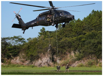 近日,陆军第72集团军某旅组织直升机搭载作战队员进行机降训练,检验飞行员与作战队员协同能力,锤炼提升部队战斗力水平。图为作战队员滑降投入训练。