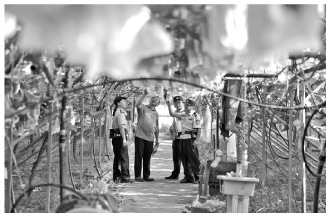 图② 近日,安徽省舒城县公安局五显派出所民警走进辖区葡萄种植园,在了解周边治安等情况的同时,宣传夏季治安打击整治行动并进行普法。图为活动现场。