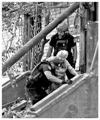 图为当地时间2024年9月25日,乌克兰克拉马托尔斯克,乌克兰警察帮助一名受伤的老年妇女从俄罗斯空袭后受损的建筑物中撤离。 CFP供图