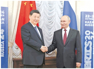 当地时间十月二十二日下午,国家主席习近平在喀山克里姆林宫同俄罗斯总统普京举行会晤。