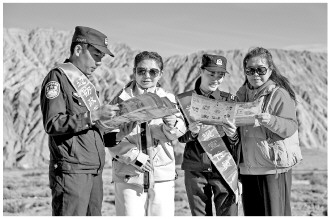 新疆出入境边防检查总站克州边境管理支队乌鲁克恰提边境派出所民警近日深入辖区景点开展普法宣传活动。图为民警向游客讲述身边法治故事,普及法律知识。 本报记者 潘从武 本报通讯员 陈相延 徐胜豪 摄