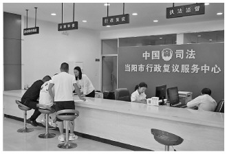 图为当阳市行政复议中心工作人员正在接待前来申请的群众。