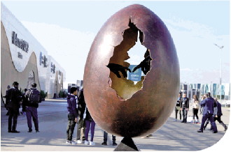 图▲ 当地时间2024年11月10日,阿塞拜疆巴库,第29届联合国气候变化大会(COP29)的入口处展示一座“破壳蛋”雕塑。 CFP供图