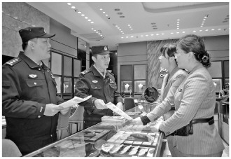 近日,山东省烟台市公安局经侦支队组织民警深入辖区黄金珠宝行业开展普法宣传,帮助企业排查安全隐患,提高从业人员的风险意识和安全意识。图为民警向从业人员剖析讲解近期各地发生的黄金珠宝行业洗钱犯罪案例。 本报通讯员 于辉 臧保东 摄