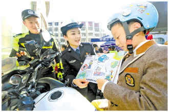 为增强群众交通安全意识,今年以来,湖北省荆门市公安局交警支队面向全社会征集交通安全宣传“创意作品”,不少市民和中小学生通过绘画、宣传标语、短视频等形式开展创作。图为一名小学生向交警展示自己的交通安全绘画作品。 本报记者 刘志月 本报通讯员 吴烁硕 摄