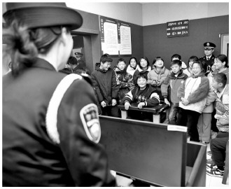 近日,安徽省阜南县公安局郜台派出所邀请郜台乡中心小学师生走进警营,零距离了解公安工作。图为民警与学生互动交流。 本报通讯员 吕乃明 摄