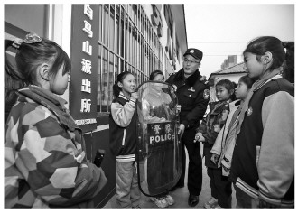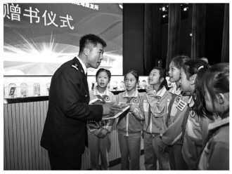 图③ 近日,山东省济南市公安局市中区分局白马山派出所举办“警营开放日”活动,邀请辖区小学生零距离感受“110”接处警等工作。图为民警向同学们展示警械。