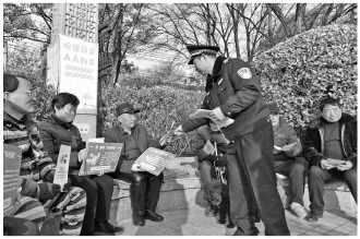 ▲ 为增强老年群体防骗意识,近日,安徽省阜南县公安局组织民辅警向老年人宣讲防范养老诈骗知识。图为一名辅警在街心公园向老年人发放反诈宣传册。