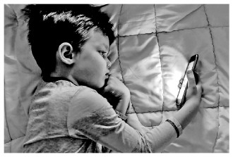 图为一名儿童深夜使用手机看视频。 (资料图片)