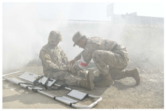 战场情况瞬息变化,情况一个接着一个。“报告指挥员,我分队遭敌袭击,有2人受伤严重,无法继续参加‘战斗’。”“迅速组织伤员救护转移。”由地方医疗专业力量组成的医疗救护分队迅速反应,穿过浓烟赶赴“战场”,现场对“伤员”进行止血、包扎处理后,用担架转移至救护车内组织后送。