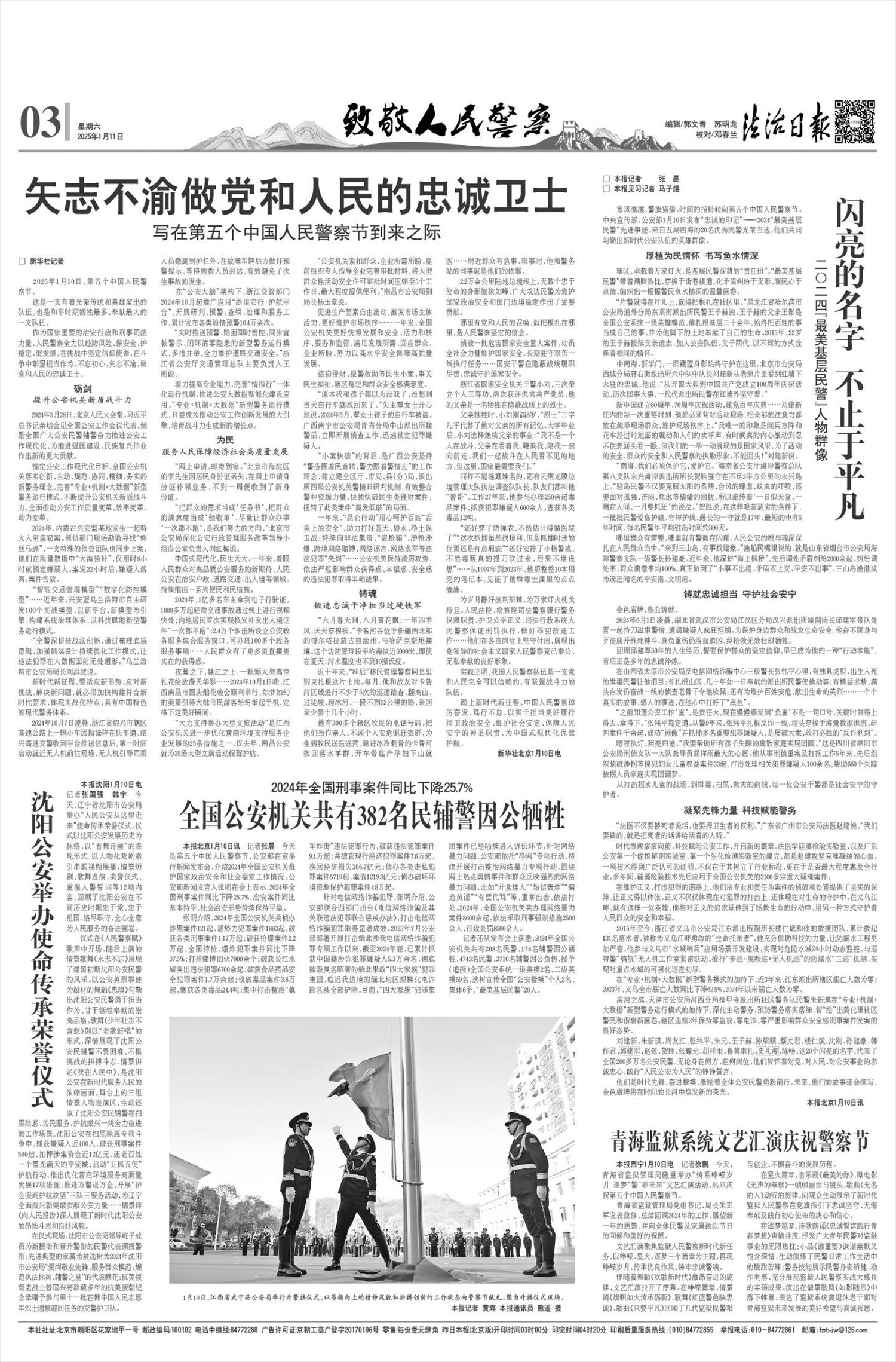 本报北京1月10日讯 记者张晨 为深入学习贯彻习近平总书记关于新时代公安工作的重要论述,大力选树宣传在公安基层一线涌现出的先进典型,推动全社会形成见贤思齐、崇尚英雄、争做先锋的良好氛围,广泛凝聚建设平安中国的力量,在第5个中国人民警察节到来之际,中央宣传部、公安部向全社会发布了2024“最美基层民警”先进事迹。
