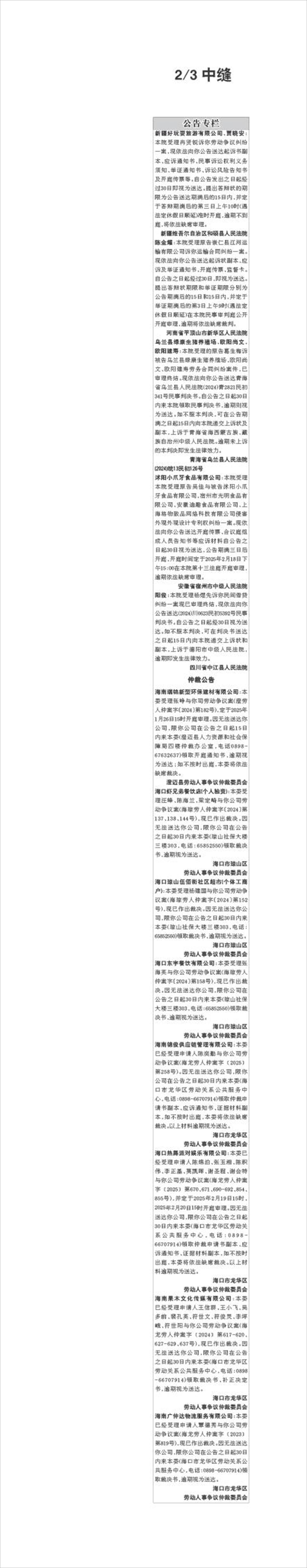 海口热舞派对娱乐有限公司:本委已经受理申请人陈绵泊、张玉湘、陈积伟、李正基、莫凯晖、谢圣程、谢会特与你公司劳动争议案(海龙劳人仲案字﹝2025﹞第670、671、690-692、854、855号),并定于2025年2月19日15时、2025年2月20日15时开庭审理。因无法送达你公司,限你公司在公告之日起30日内来本委(海口市龙华区劳动关系公共服务中心,电话:0898-66707914)领取仲裁申请书副本、应诉通知书、证据材料副本,如不按时出庭,本委将依法缺席裁决。以上材料逾期视为送达。