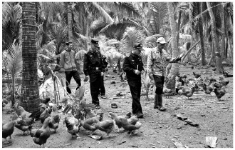 近日,海南省公安厅海岸警察总队第三支队组织琼海和万宁市各海岸派出所立足辖区产业特色,适时开展“养殖警务”和“果园警务”,护航辖区乡村振兴。图为琼海市公安局青葛海岸派出所民辅警走访椰林走地鸡养殖户。 本报记者 翟小功 本报通讯员 吴凡 代龙超 摄