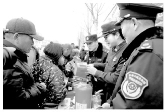 近日,山东省枣庄市公安局山亭分局山城派出所联合当地市场监管、消防等部门将普法“小摊”搬进集市,向赶集群众宣传与群众自身息息相关的法律法规,辨别消防产品真伪的方法和技巧,以及日常生活中经常接触的用火、用电、用气,火灾自救逃生等消防安全常识。图为工作人员在集市上向赶集群众宣传消防安全知识。 本报通讯员 季龙 摄
