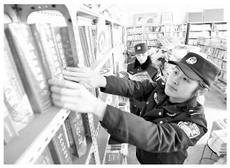 近日,河南省浚县公安局白寺派出所组织民警深入辖区学校周边文化经营场所开展清查整治行动。图为民警在检查一学校附近书店是否存在影响青少年身心健康的出版物。