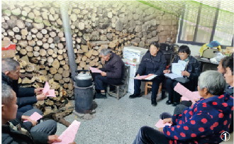 图① 2024年2月,全国政协委员、安徽省金寨县花石乡党委政法委员余静(左四)在花石乡大湾村朱湾组,向群众普及用火用电、护林防火等安全知识。