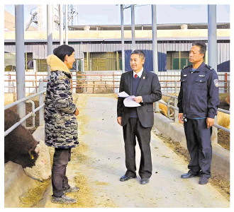 图为袁学文(中)向西吉县兴隆镇养牛大户了解养殖情况。