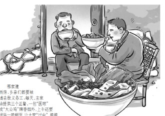 过年招待川流不息的拜年客,常见的是一碗面条。面条里放有一个系着红丝线的鸡腿,这鸡腿系大年三十夜一家人吃鸡汤面时特地留下的,或是从邻居家借来装点门面的,约定俗成,是不能吃的。特别是从邻家借来的,更得“有借有还”。常有一些少不更事的小拜年客,把鸡腿给吃了,这让主家十分难堪。这时的蓝边碗,承载的是无尽的尴尬与无奈。