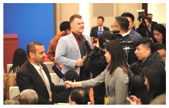 图② 3月3日,全国政协十四届三次会议新闻发布会后,国外媒体记者接受采访。 本报记者 徐伟伦 摄